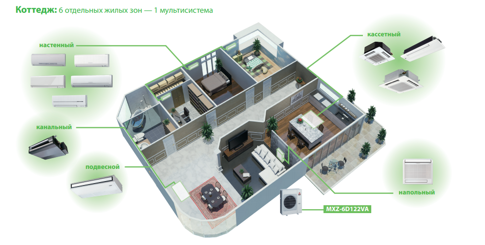 Подключение от 2 до 6 внутренних блоков различного конструктивного исполнения.